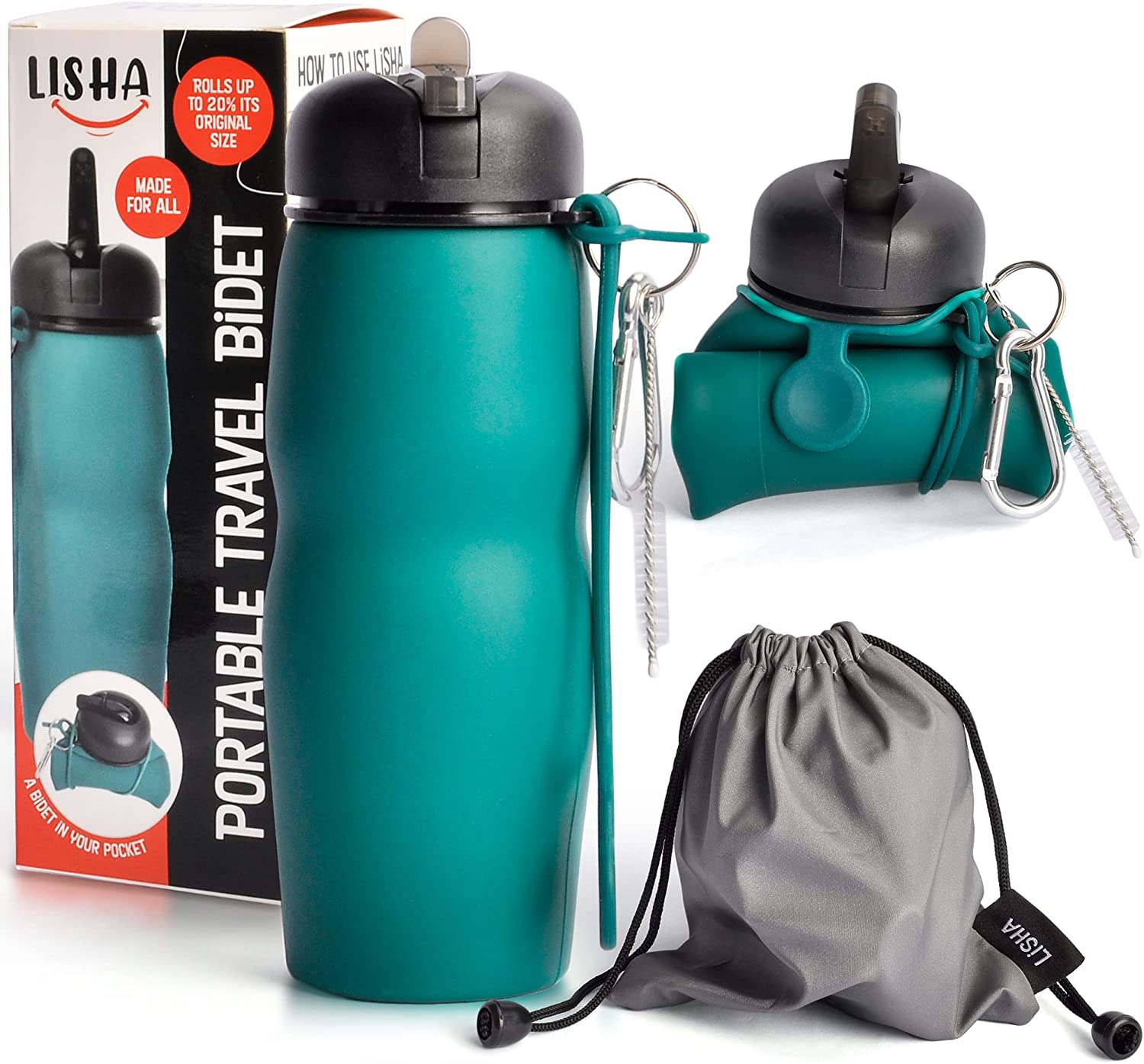 • INCLUDES DUST BAG and cleaning brush for storage and care of your Lisha Travel Bidet Bottle. Our peri bottle also comes outfitted with a carabiner clip for attachment to a backpack strap or belt loop.