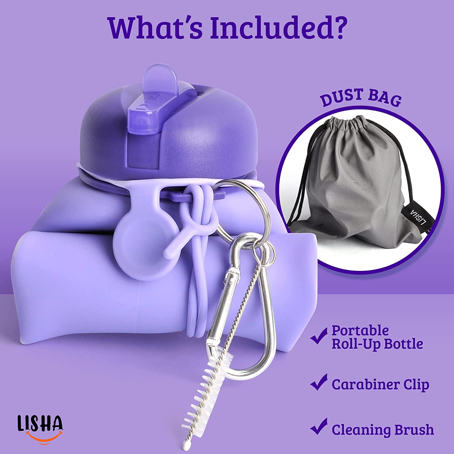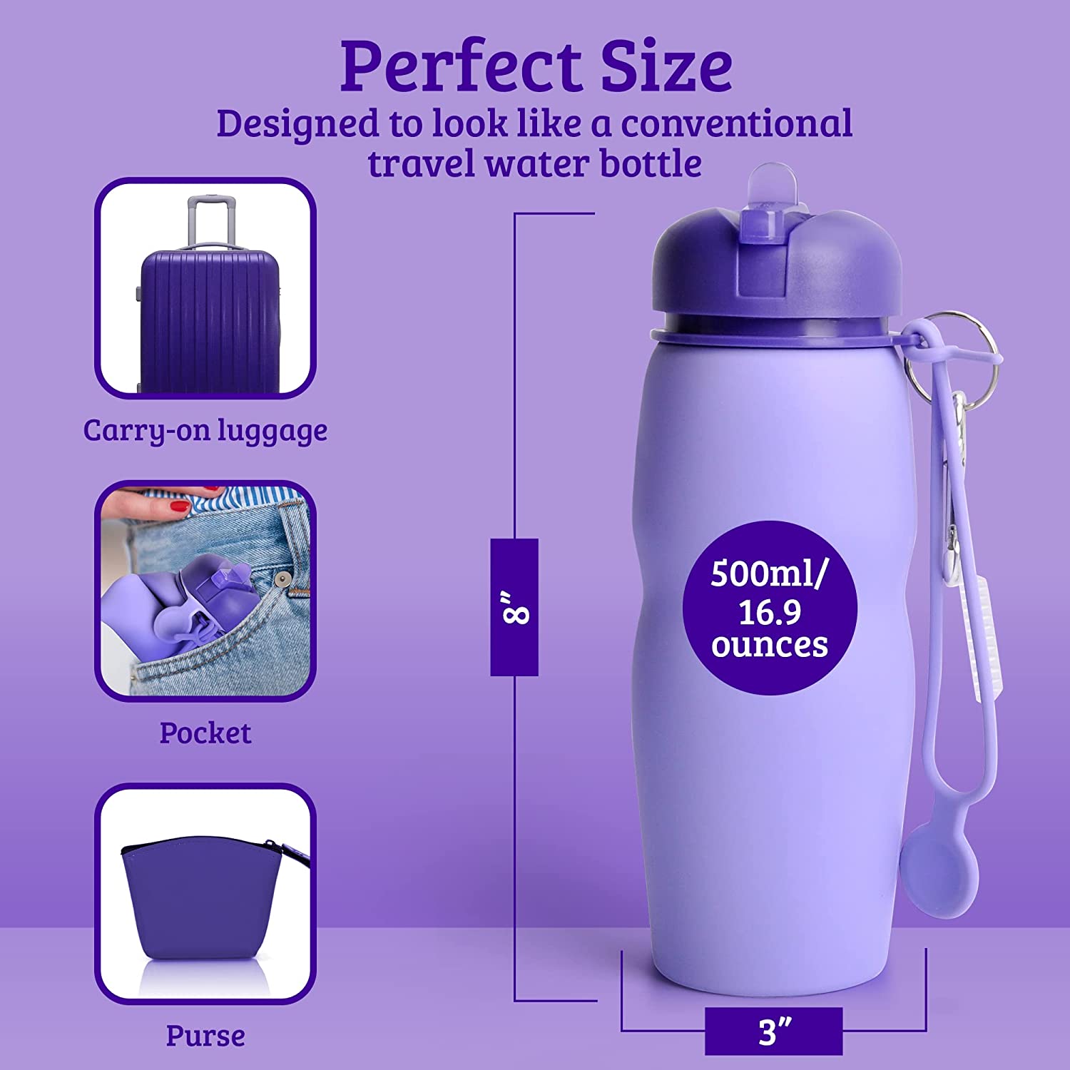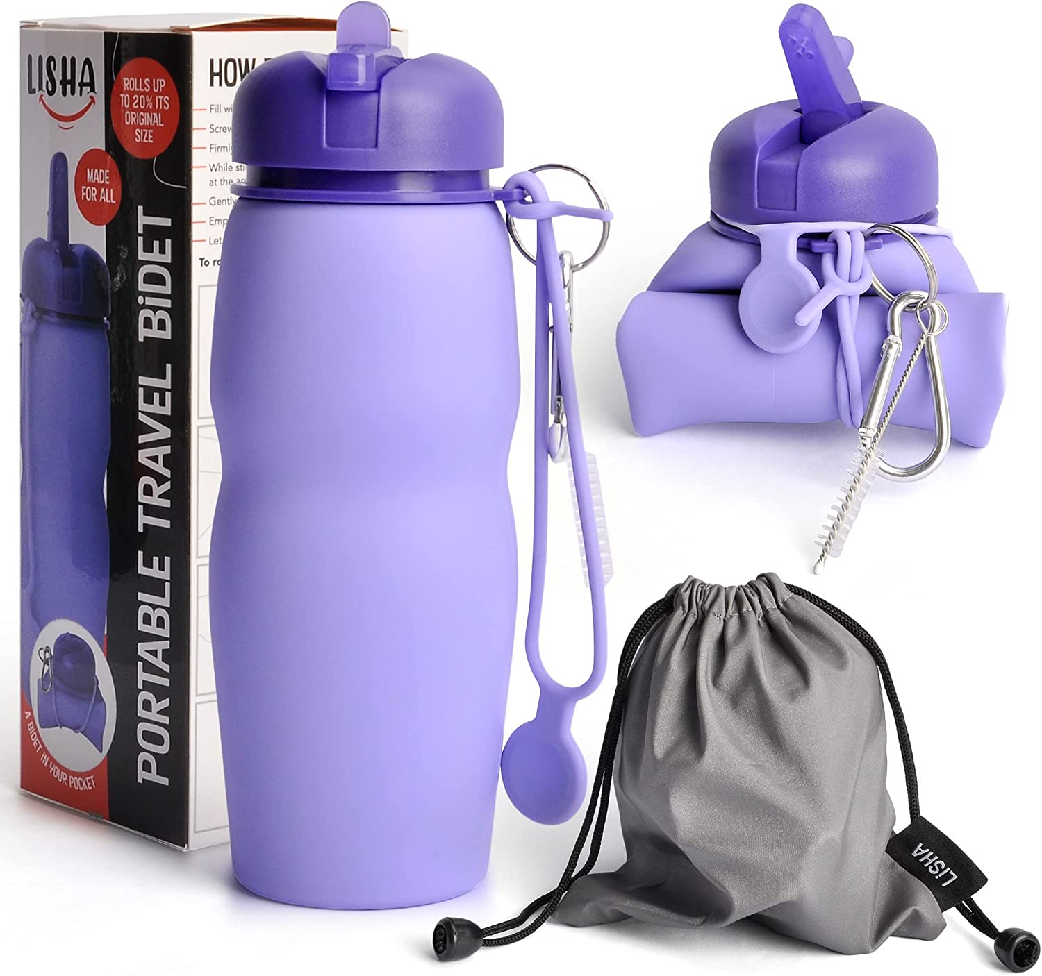 Lisha Portable Bidet for Travel, Peri Bottle, Rolls-Up Compactly for Discreet Carry, Silicone Bidet Bottle with Leakproof Lid, Dust Bag and Clip (16.9 oz. Capacity) (Purple)