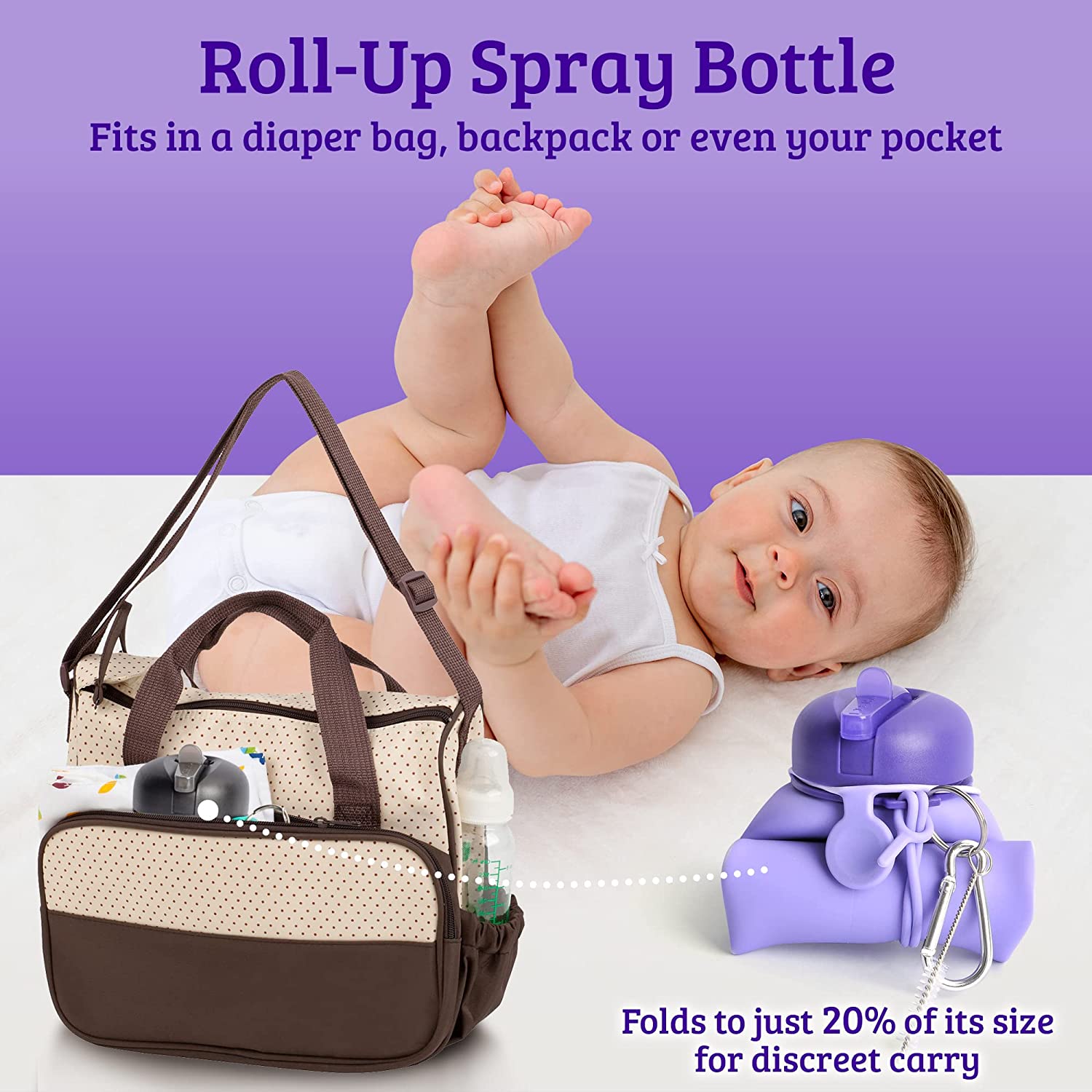 ROLL-UP PERI BOTTLE for feminine care and postpartum recovery fits in a diaper bag, backpack or even your purse. Our portable bidet for women folds to just 20% of its size for discreet carry.