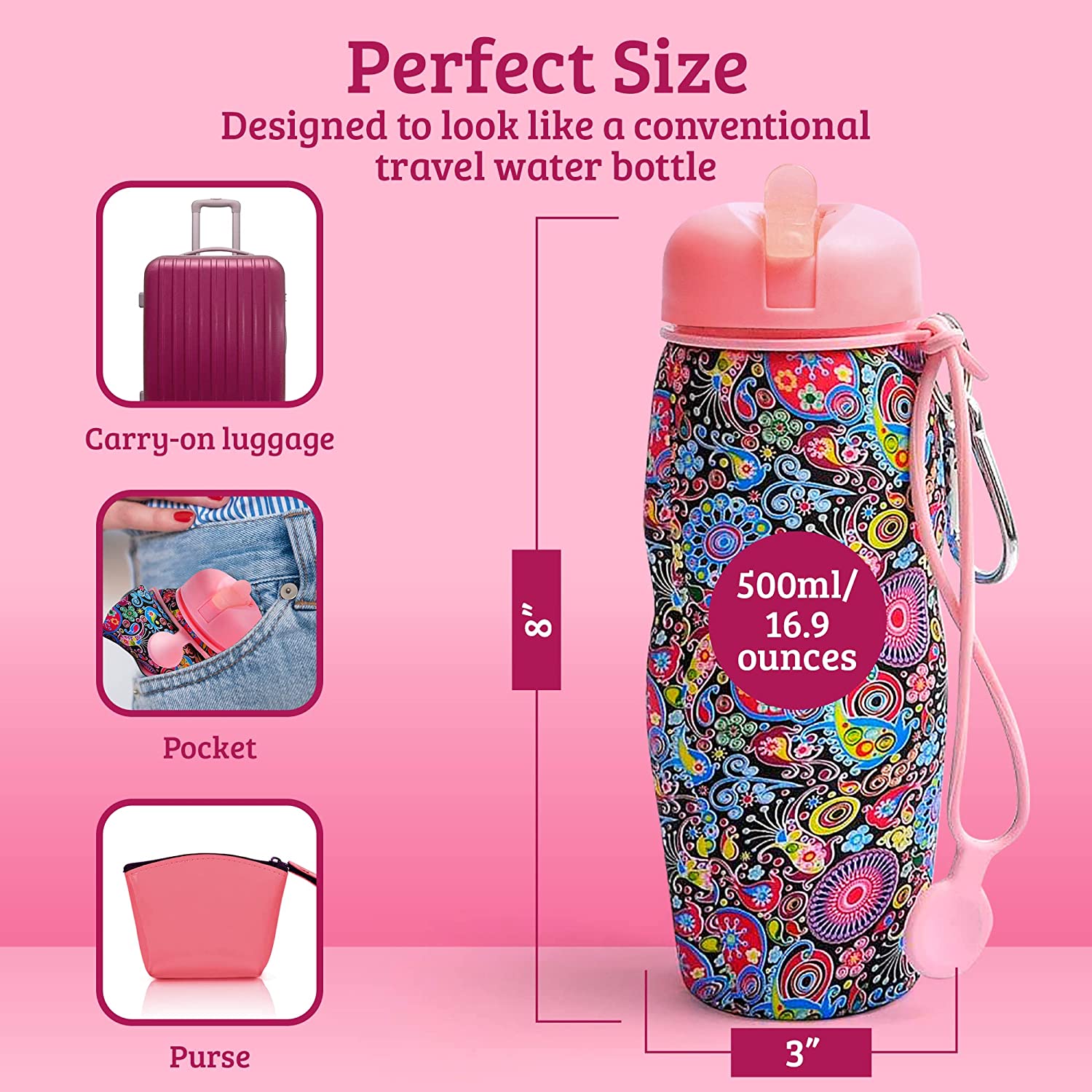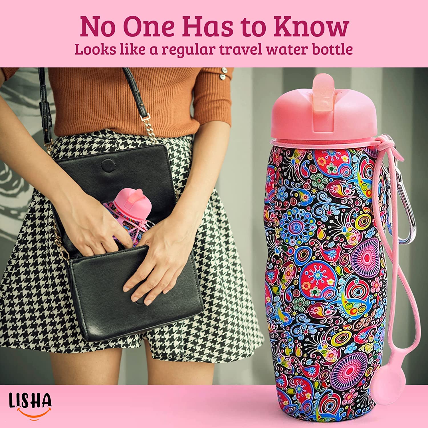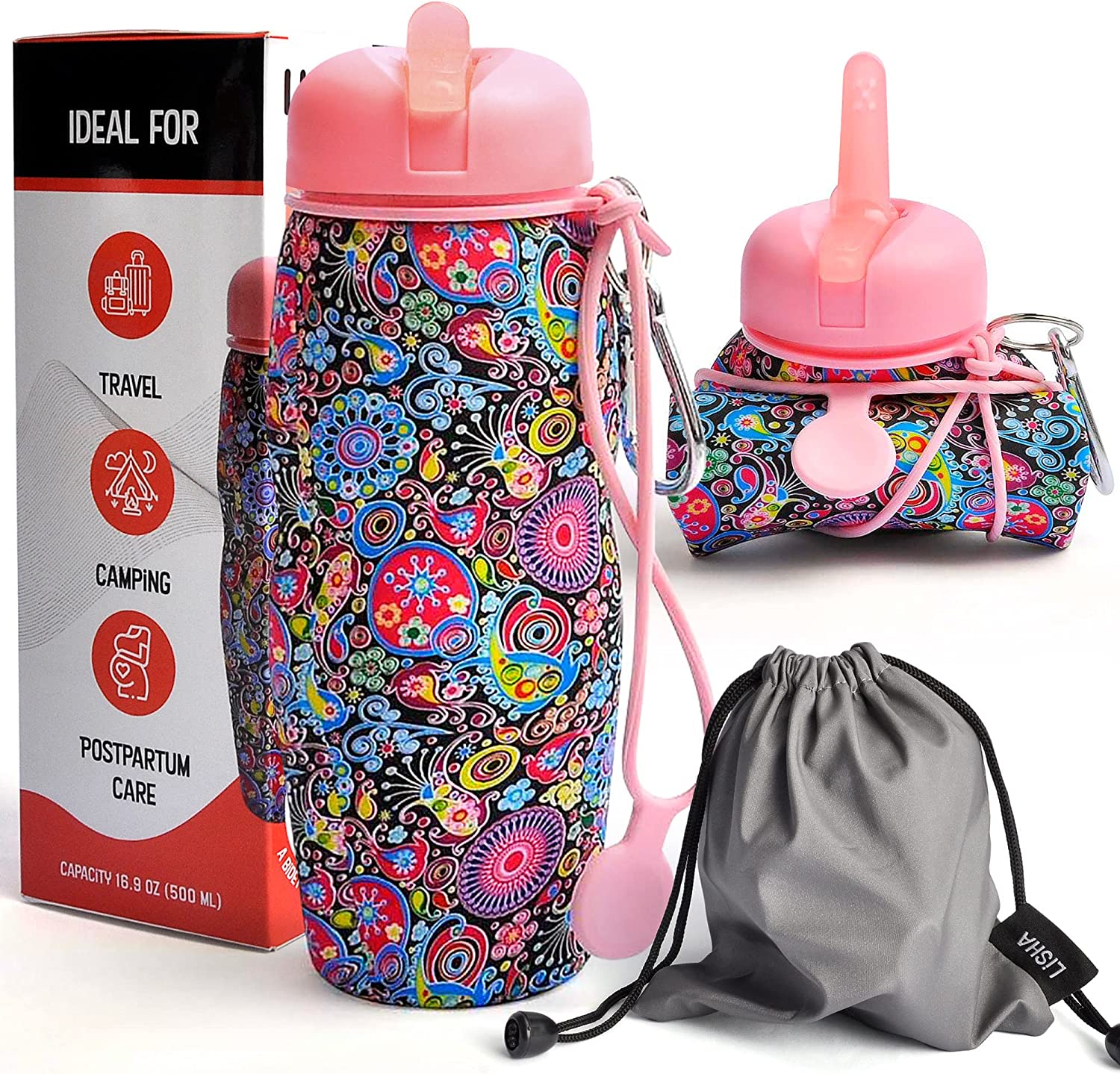 Lisha Portable Travel Bidet, Peri Bottle, Rolls-Up Compactly for Discreet Carry, Silicone Bidet Bottle with Leakproof Lid, Dust Bag and Clip (16.9 oz Capacity) Summer