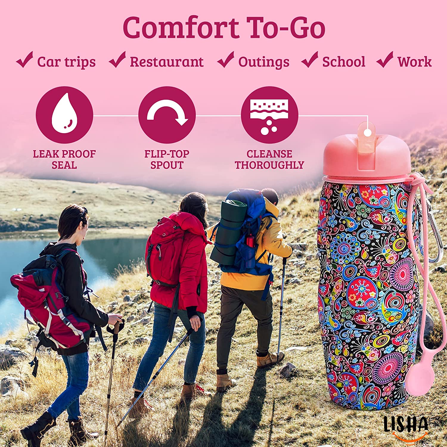 • SOFT, SQUEEZABLE food-grade silicone and a flip-straw cap make the Lisha Portable Bidet for travel easy to use in an airport bathroom or while camping. It stands sturdy and tall even when empty.